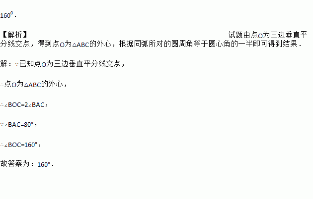已知O为三边垂直平分线交点,∠BAC=80°,则∠BOC= .