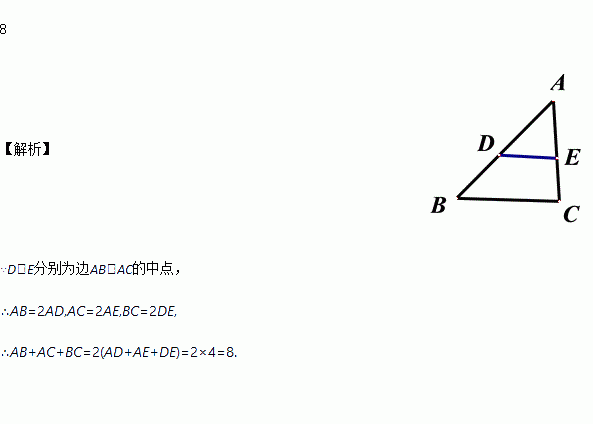 在△ABC中,已知D、E分别为边AB、AC的中点,若△ADE的周长为4cm,则△ABC的周长为_______cm .