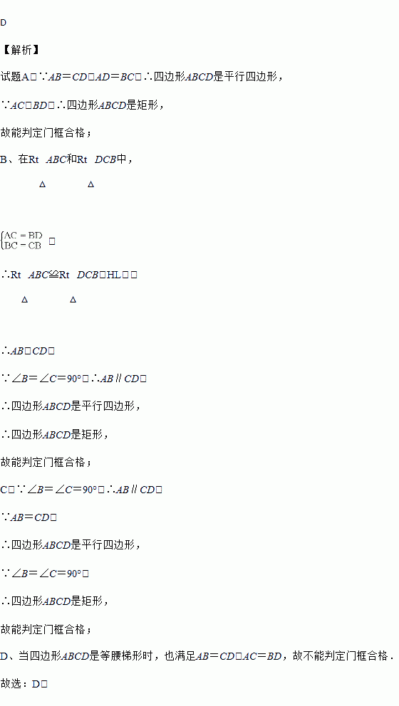 A. AB=CD,AD=BC,AC=BD B. AC=BD,∠B=∠C=90° C. AB=CD,∠B=∠C=90° D. AB=CD,AC=BD