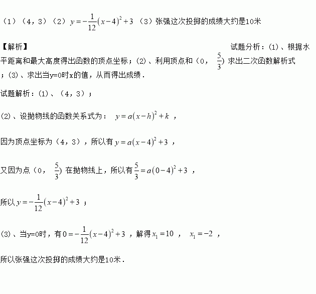 (1)(4,3)(2)(3)张强这次投掷的成绩大约是10米 【解析】试题分析:(1)、根据水平距离和最大高度得出函数的顶点坐标;(2)、利用顶点和(0, 求出二次函数解析式;(3)、求出当y=0时x的值,从而得出成绩. 试题解析:(1)、(4,3); (2)、设抛物线的函数关系式为: , 因为顶点坐标为(4,3),所以有, 又因为点(0, 在抛物线上,所以有, ...