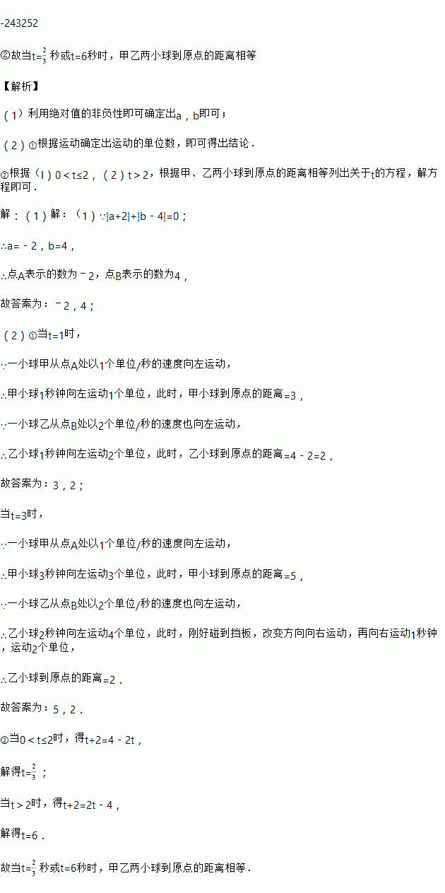 (2)若在原点O处放一挡板,一小球甲从点A处以1个单位/秒的速度向左运动;同时另一小球乙从点B处以2个单位/秒的速度也向左运动,在碰到挡板后(忽略球的大小,可看作一点)以原来的速度向相反的方向运动,设运动的时间为t(秒),