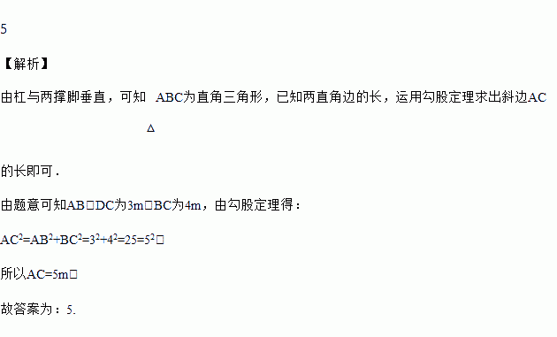 王师傅在操场上安装一副单杠,要求单杠与地面平行,杠与两撑脚垂直,如图所示,撑脚长AB,DC为3 m,两撑脚间的距离BC为4 m,则AC=____m就符合要求.