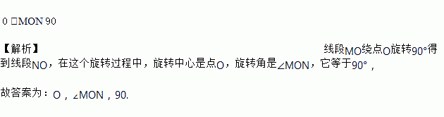 如图,线段MO绕点O旋转90°得到线段NO,在这个旋转过程中,旋转中心是___,旋转角是____,它等于___度.
