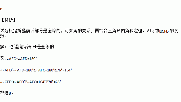 将五边形纸片ABCDE按如图所示方式折叠,折痕为AF,点E、D分别落在E′,D′,已知∠AFC=76°,则∠CFD′等于( )
