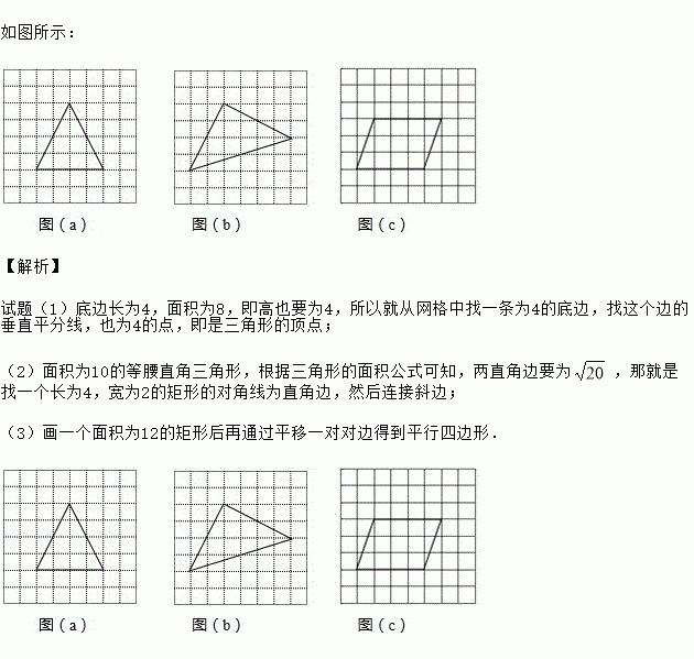 图(a)、图(b)、图(c)是三张形状、大小完全相同的方格纸,方格纸中的每个小正方形的边长均为1.请在图(a)、图(b)、图(c)中,分别画出符合要求(1),(2),(3)的图形,所画图形各顶点必须与方格纸中的小正方形顶点重合.