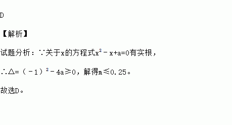 D 【解析】 试题分析:∵关于x的方程式x2﹣x+a=0有实根, ∴△=(﹣1)2﹣4a≥0,解得m≤0.25。 故选D。