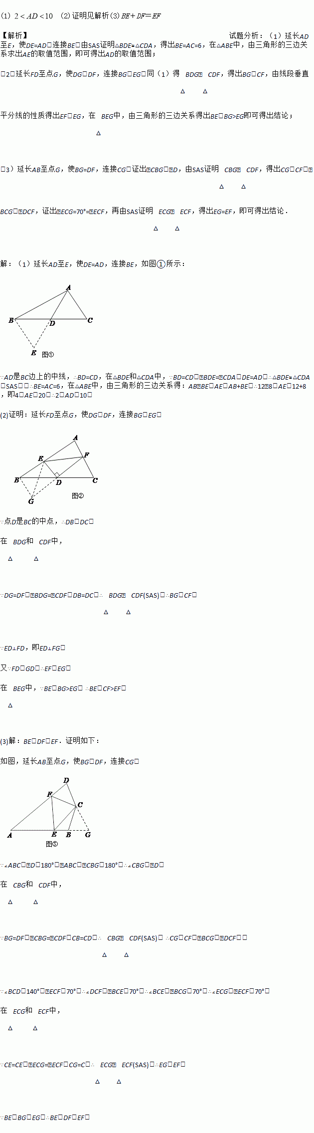(1)如图①,在△ABC中,若AB=12,AC=8,求BC边上的中线AD的取值范围.