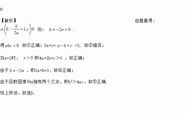 D 【解析】由题意得: 则: . 得 故①正确;3a+c= <0, 故②错误; 当x=2时, 即4a+2b+c>0 ,故正确; 由于,即2a+b=0,故④正确; 由于函数图像与x轴有两个交点,即b2>4ac,故⑤正确. 综上所述,故选D.