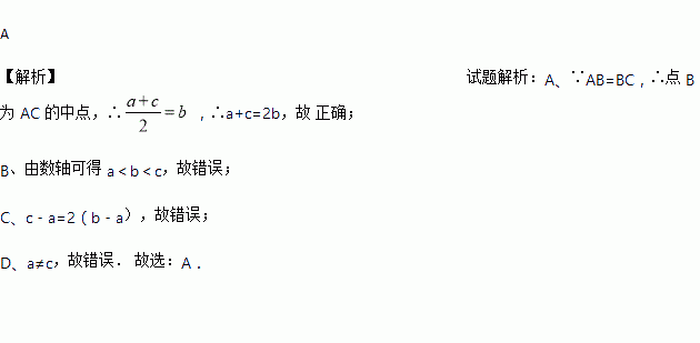 如图,数轴上的 A、B、C 三点所表示的数分别为 a、b、c,AB=BC,则下 列关系正确的是( )