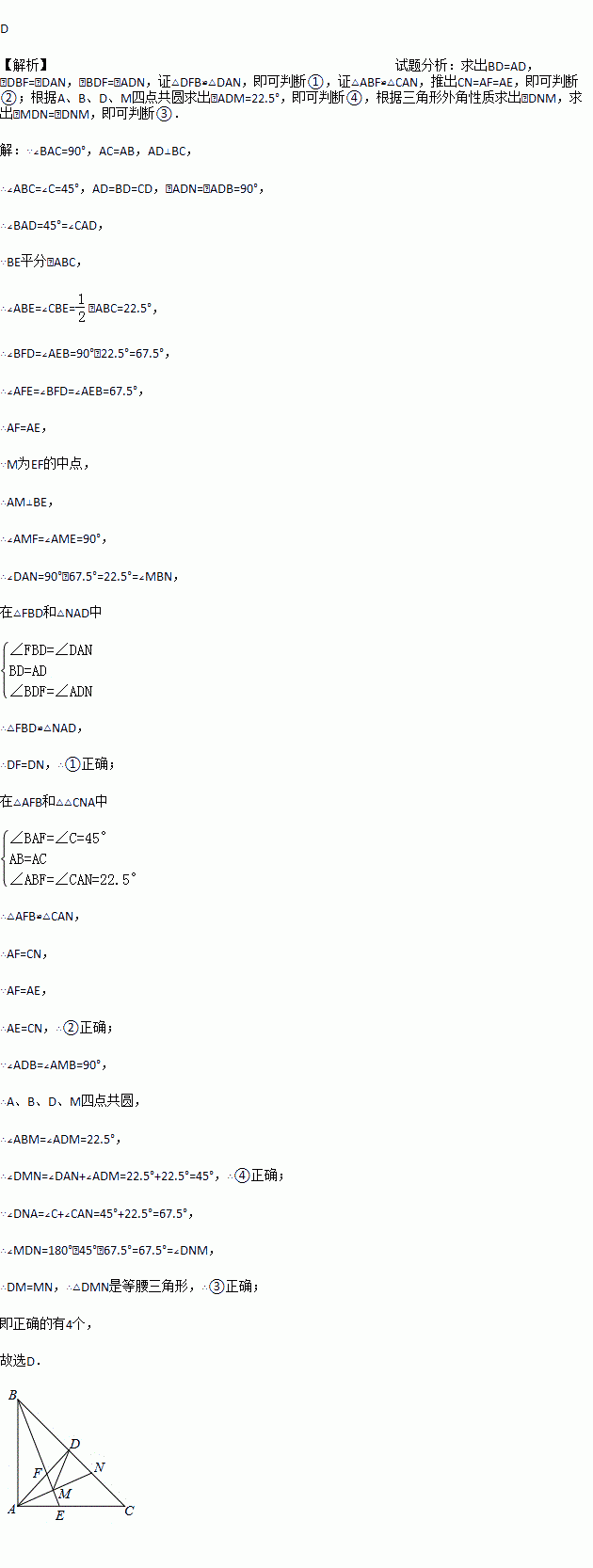 如图,等腰Rt△ABC中,∠BAC=90°,AD⊥BC于D,∠ABC的平分线分别交AC、AD于E、F两点,M为EF的中点,延长AM交BC于点N,连接DM.下列结论:①DF=DN ②AE=CN;③△DMN是等腰三角形;④∠BMD=45°,其中正确的结论个数是 ( )