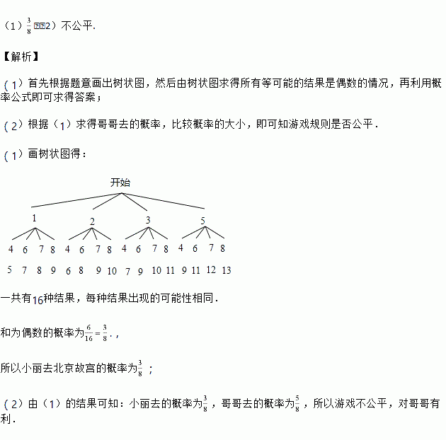 今年暑假,小丽爸爸的同事送给她爸爸一张北京故宫的门票,她和哥哥两人都很想去参观,可门票只有一张.读九年级的哥哥想了一个办法,他拿了八张扑克牌,将数字为1,2,3,5的四张牌给小丽,将数字为4,6,7,8的四张牌留给自己,并按如下游戏规则进行:小利哥哥从各自的四张牌中随机抽出一张,然后将抽出的两张扑克牌上的数字相加,如果和为偶数,和小丽去;如果和为奇数,则哥哥去.