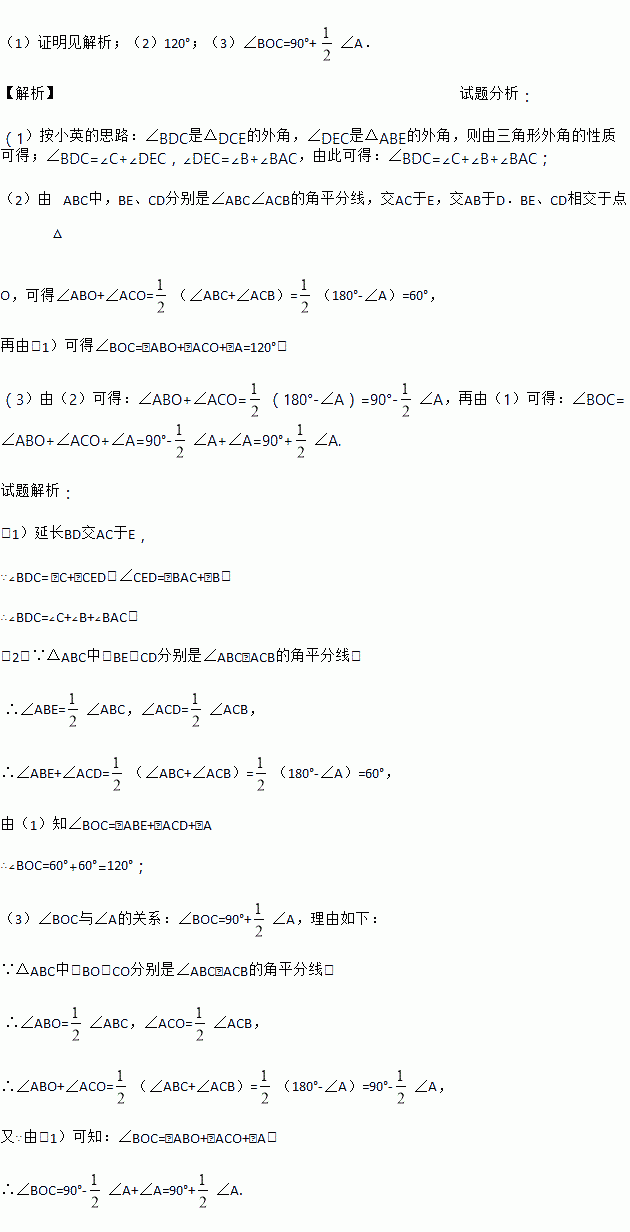(1)按小英的思路完成∠BDC=∠B+∠C+∠BAC这一结论.