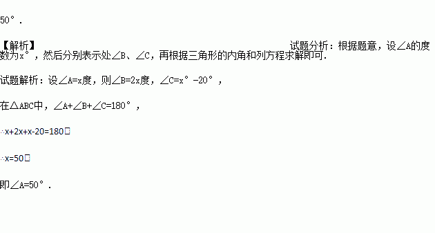 已知:△ABC中,∠B=2∠A,∠C=∠A-20°,求∠A的度数.