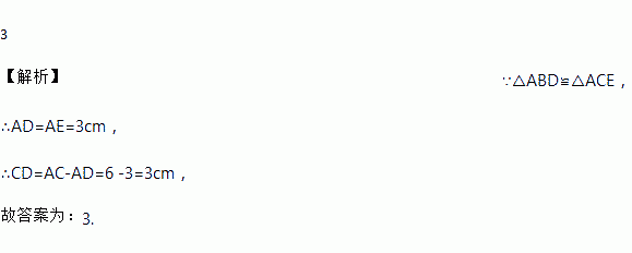 如图,△ABD≌△ACE,AE=3cm,AC=6 cm,则CD=__________cm.