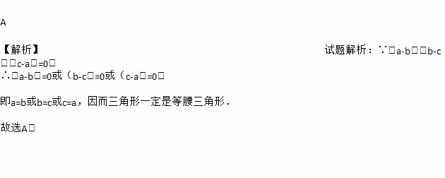 A 【解析】试题解析:∵(a-b)(b-c)(c-a)=0, ∴(a-b)=0或(b-c)=0或(c-a)=0, 即a=b或b=c或c=a,因而三角形一定是等腰三角形. 故选A.