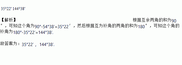 35°22′ 144°38′ 【解析】根据互余两角的和为90°,可知这个角为90°-54°38′=35°22′,然后根据互为补角的两角的和为180°,可知这个角的补角为180°-35°22′=144°38′. 故答案为:35°22′, 144°38′.
