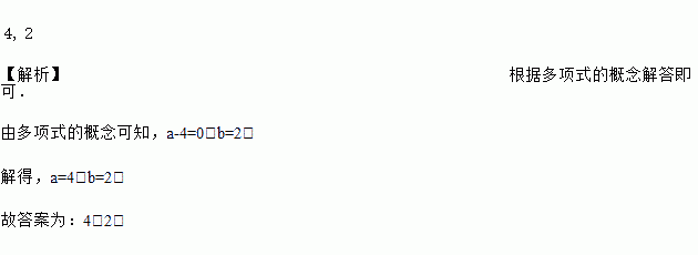 若关于x的多项式(a-4)x3-xb+x-b是二次三项式,则a=________,b=________.