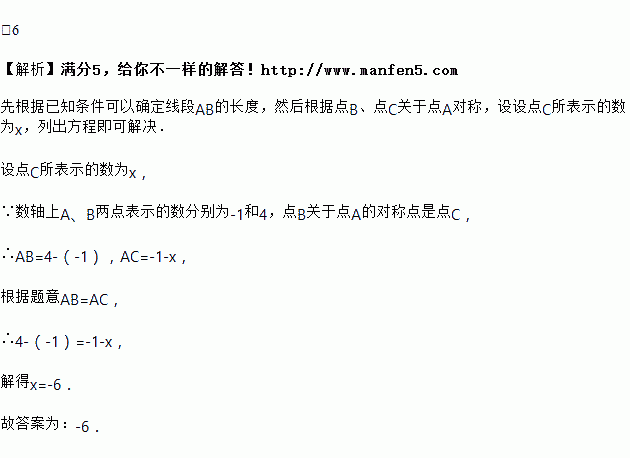 如图,在数轴上,点A表示的数为﹣1,点B表示的数为4,C是点B关于点A的对称点,则点C表示的数为______.