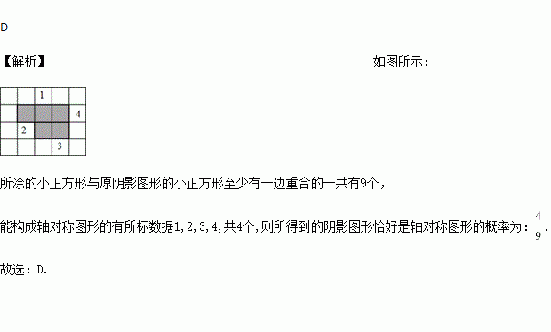 如图,在空白网格内将某一个小正方形涂成阴影部分,且所涂的小正方形与原阴影图形的小正方形至少有一边重合.小红按要求涂了一个正方形,所得到的阴影图形恰好是轴对称图形的概率为