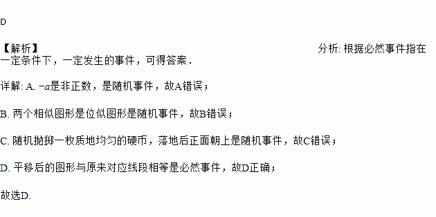 C. 随机抛掷一枚质地均匀的硬币,落地后正面朝上 D. 平移后的图形与原来的图形对应线段相等