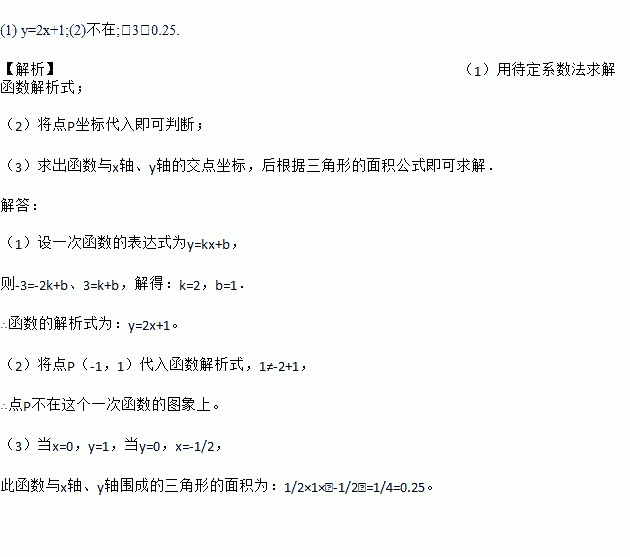 (1) y=2x+1;(2)不在;(3)0.25. 【解析】(1)用待定系数法求解函数解析式; (2)将点P坐标代入即可判断; (3)求出函数与x轴、y轴的交点坐标,后根据三角形的面积公式即可求解. 解答: (1)设一次函数的表达式为y=kx+b, 则-3=-2k+b、3=k+b,解得:k=2,b=1. ∴函数的解析式为:y=2x+1。 (2)将点P...