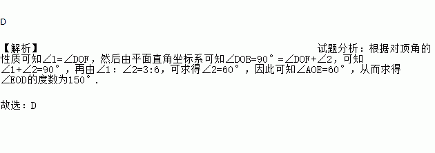 如图,直线AB、CD、EF相交于点O,其中AB⊥CD,∠1:∠2=3:6,则∠EOD=( )