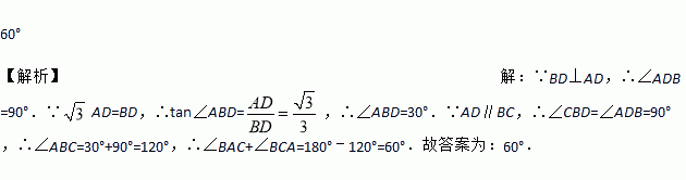 如图,在四边形ABCD中,连接AC,BD,AC和BD相交于点E.若AD∥BC,BD⊥AD,2DE=BE, AD=BD,则∠BAC+∠BCA的度数为_______.