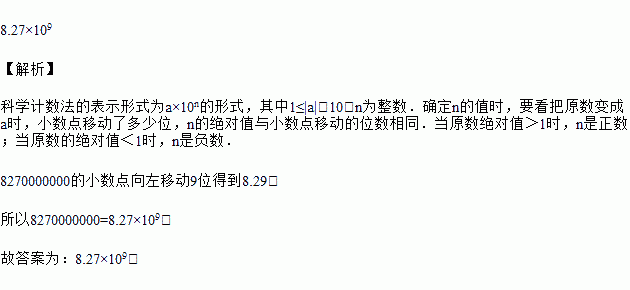 第十三届全国人民代表大会政府工作报告中说到,五年来我国国内生产总值已增加到8270000000万元,将数据8270000000用科学计数法表示为_____.