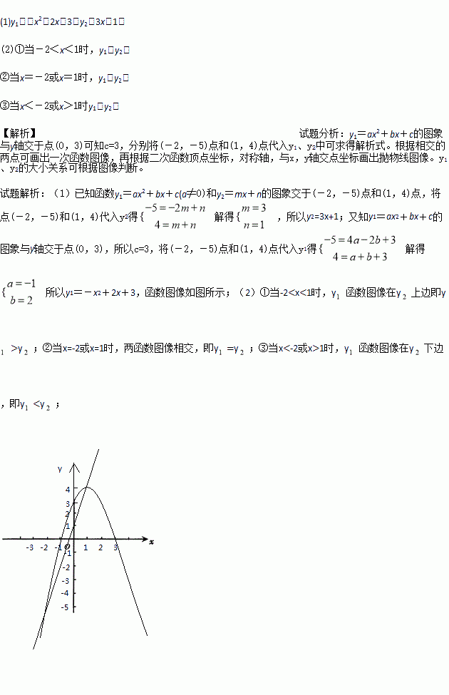 已知函数y1=ax2+bx+c(a≠0)和y2=mx+n的图象交于(-2,-5)点和(1,4)点,并且y1=ax2+bx+c的图象与y轴交于点(0,3).