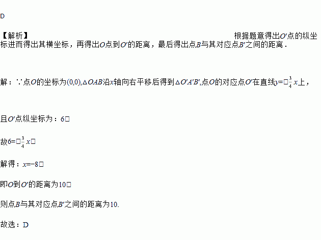 如图,在平面直角坐标系中,将△OAB沿直线y=-x平移后,点O′的纵坐标为6,则点B平移的距离为()