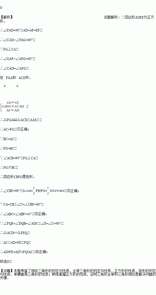如图,CB=CA,∠ACB=90°,点D在边BC上(与B,C不重合),四边形ADEF为正方形,过点F作FG⊥CA,交CA的延长线于点G,连接FB,交DE于点Q,给出以下结论:①AC=FG;②S△FAB∶S四边形CBFG=1∶2;③∠ABC=∠ABF;④AD2=FQ·AC,其中正确结论的个数是( )