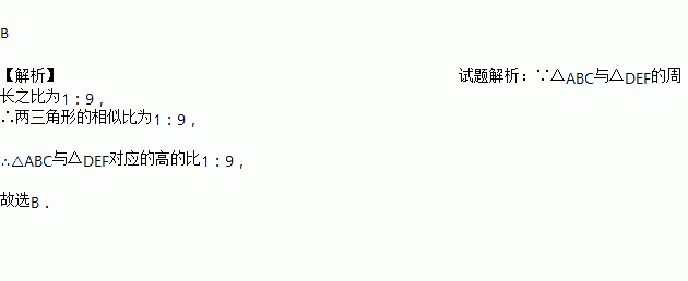 已知△ABC∽△DEF,且周长之比为1∶9,则△ABC与△DEF的高的比为( )