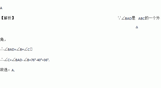 如图,在△ABC中,D是CA延长线上一点,∠B=40,∠BAD=76,则∠C的度数为( )