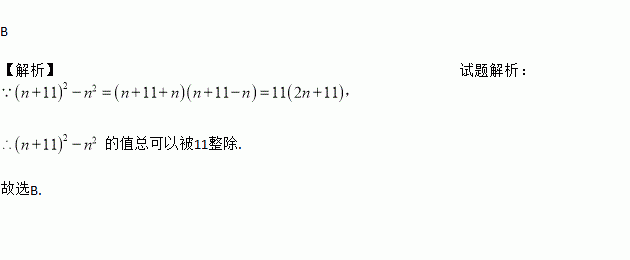 若n为任意整数,(n+11)2-n2的值总可以被k整除,则k的值等于( )