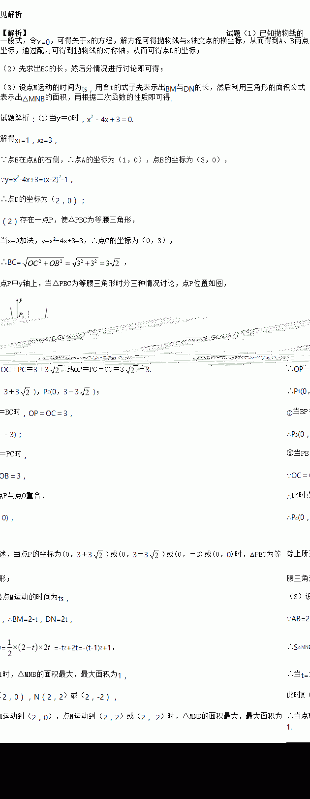 (3)若动点M从点A出发,以每秒1个单位长度的速度沿AB向点B运动,同时另一个动点N从点D出发,以每秒2个单位长度的速度在抛物线的对称轴上运动,当点M到达点B时,点M,N同时停止运动,问点M,N运动到何处时,∆MNB的面积最大,试求出最大面积.
