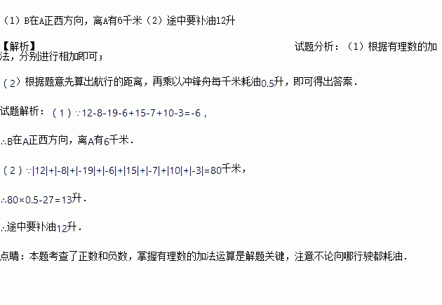 在抗洪抢险中,人民解放军的冲锋舟沿东西方向的河流抢救灾民,早晨从A地出发,晚上到达B地,约定向东为正方向,当天航行路程记录如下:12,-8,-19,-6,15,-7,10,-3(单位:千米).
