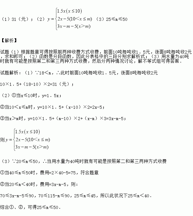 (3)若该用户六月份用水量为40吨,缴纳水费y元的取值范围为70≤y≤90,试求m的取值范围.