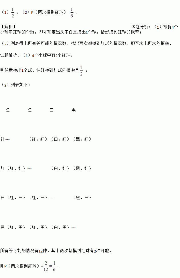(2)先从中任意摸出一个球,再从余下的3个球中任意摸出1个球,请用列举法(画树状图或列表),求两次都摸到红球的概率.