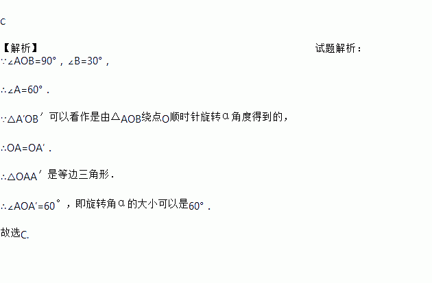 如图,∠AOB=90°,∠B=30°,△A’OB’可以看作是由△AOB绕点O顺时针旋转角度得到的,若点A’在AB上,则旋转角![]()