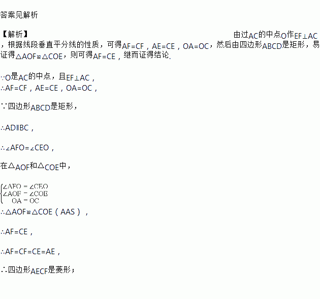 如图所示,点O是矩形ABCD对角线AC的中点,过点O作EFAC,交BC交于点E,交AD于点F,连接AE、CF ,求证:四边形AECF是菱形.