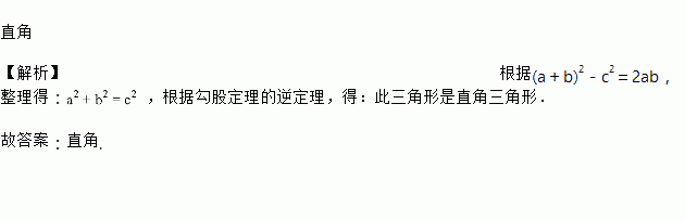 若三角形的三边长为a,b,c,且满足等式(a+b)2-c2=2ab,则此三角形是______三角形.(填“直角”“锐角”或“钝角”)