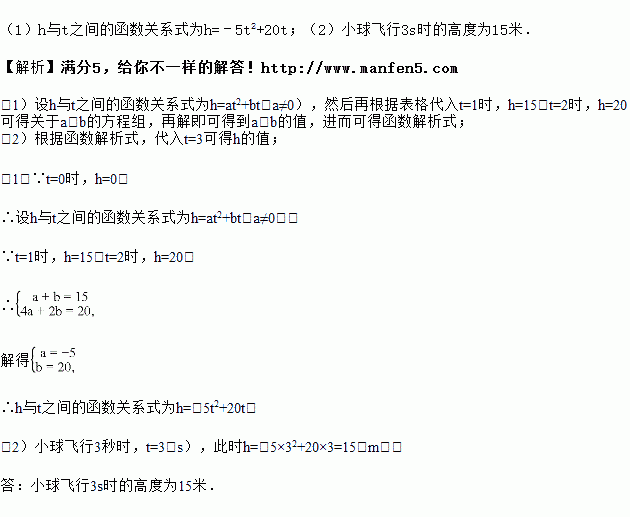 高尔夫运动员将一个小球沿与地面成一定角度的方向击出,在不考虑空气阻力的条件下,小球的飞行高度h(m)与它的飞行时间(s)满足二次函数关系,t与h的几组对应值如下表所示: