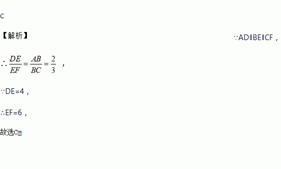 如图,AD∥BE∥CF,直线l1,l2与这三条平行线分别交于点A,B,C和点D,E,F, =,DE=4,则EF的长为( )