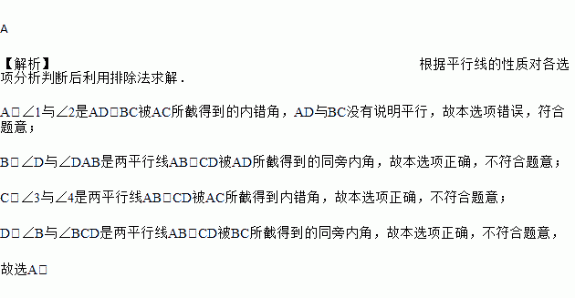 A. ∠1=∠2 B. ∠D+∠DAB=180° C. ∠3=∠4 D. ∠B+∠BCD=180°