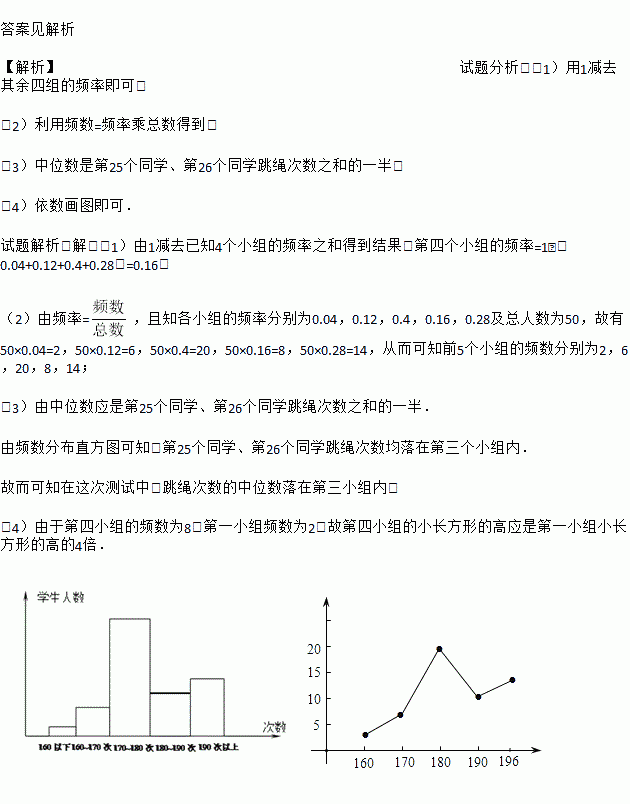 为了解中学生的体能情况,某校抽取了50名八年级学生进行一分钟跳绳次数测试,将所得数据整理后,画出了频数分布直方图如下图所示已知图中从左到右前第一、第二、第三、第五小组的频率分别为0.04 , 0.12 ,0.4 ,O.28 ,根据已知条件解答下列问题: