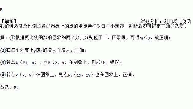 B 【解析】试题分析:利用反比例函数的性质及反比例函数的图象上的点的坐标特征对每个小题逐一判断后即可确定正确的选项. 【解析】 ①根据反比例函数的图象的两个分支分别位于二、四象限,可得m<0,故正确; ②在每个分支上y随x的增大而增大,正确; ③若点A(﹣1,a)、点B(2,b)在图象上,则a>b,错误; ④若点P(x,y)在图象上,则点P1(﹣x,﹣y)也在图象上...