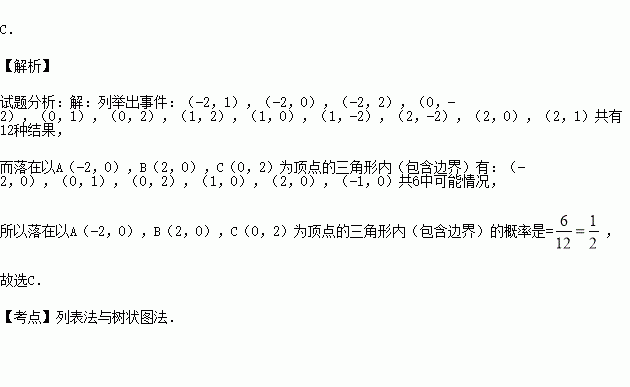 如图,一个质地均匀的正四面体的四个面上依次标有数字-2,0,1,2,连续抛掷两次,朝下一面的数字分别是a,b,将其作为M点的横、纵坐标,则点M(a,b)落在以A(-2,0),B(2,0),C(0,2)为顶点的三角形内(包含边界)的概率是( )