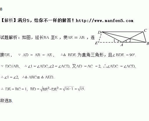 如图所示,四边形ABCD中,DC∥AB,BC=1,AB=AC=AD=2.则BD的长为( )