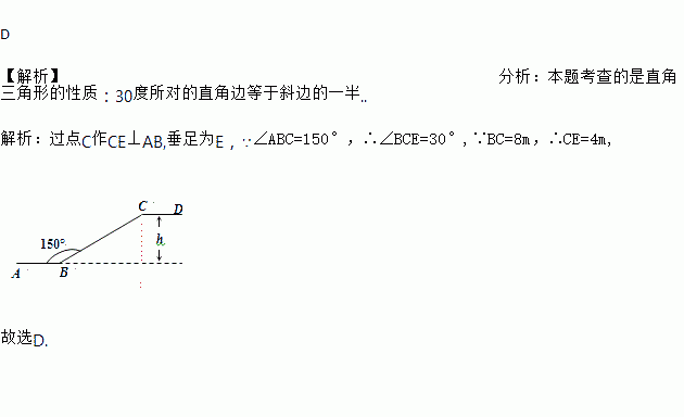 某商场一楼与二楼之间的手扶电梯如图所示.其中AB、CD分别表示一楼、二楼地面的水平线,∠ABC=150°,BC的长是8 m,则乘电梯从点B到点C上升的高度h是( )
