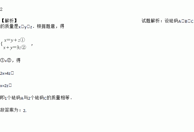 如图1,在第一个天平上,砝码A的质量等于砝码B加上砝码C的质量;如图2,在第二个天平上,砝码A加上砝码B的质量等于3个砝码C的质量.请你判断:1个砝码A与__________个砝码C的质量相等.